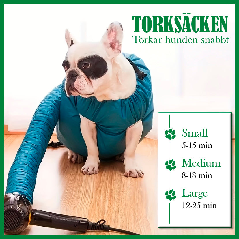 Torksäcken är tillverkad av ett mjukt blandat tyg som transporterar bort fukt. Den hjälper din hund att värma upp sig snabbt och hålla sig lugn efter badet eller efter en regnig promenad.